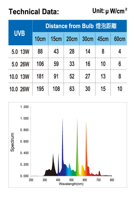 1. UVB 5.0紫外線輸出強度較柔和,適合所有生活在熱帶和亞熱帶對紫外線要求適中的爬寵類,例如:星龜、巴西龜、中華龜、傘蜥、棕靴、黑靴、澤龜、箱龜、角蛙、守宮、蟒蛇、變色龍等大多數雨林型陸龜、水龜、兩棲類與鳥類。