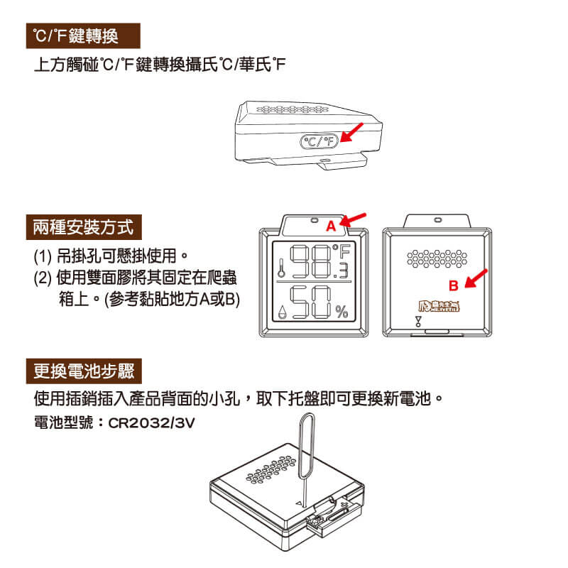 (2)使用雙面膠將其固定在爬蟲箱上(參考黏貼地方 A或B)