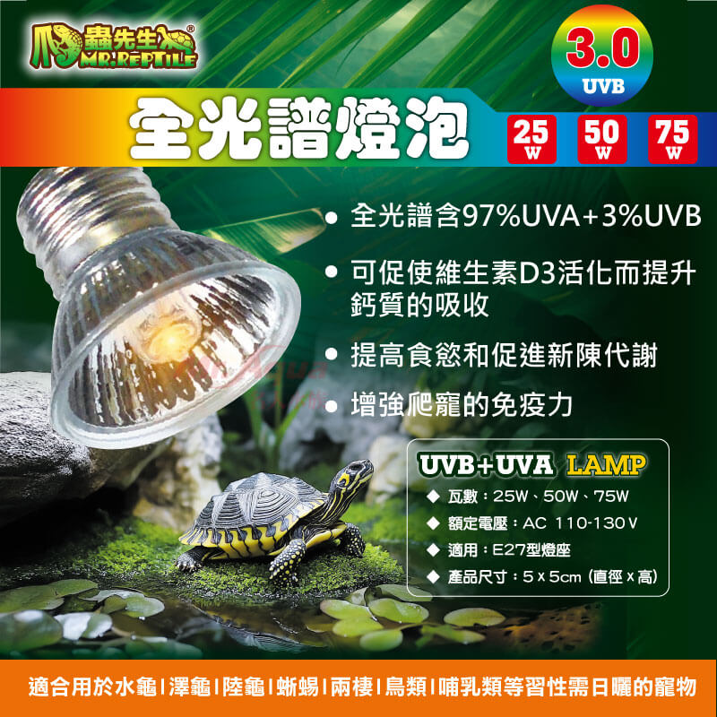 1.全光譜含97%UVA+3%UVB可促使維生素D3活化而提升鈣質的吸收,提高食慾和促進新陳代謝,增強爬寵的免疫力